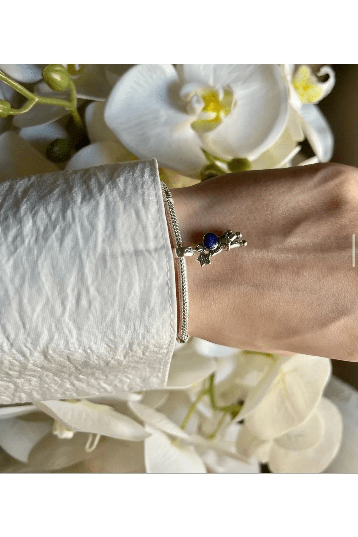 Galaksideki Astronot Sallantılı FUBENA Charm ile galaksinin mucizelerini keşfet. Bu 925 ayar gümüş charm’da uzay kâşifinin takımı minik boncuklarla işlendi ve oksijen tüpü ise şeffaf kübik zirkon bir taştan oluşuyor. Mavi mine kaskın içini aydınlatıyor.