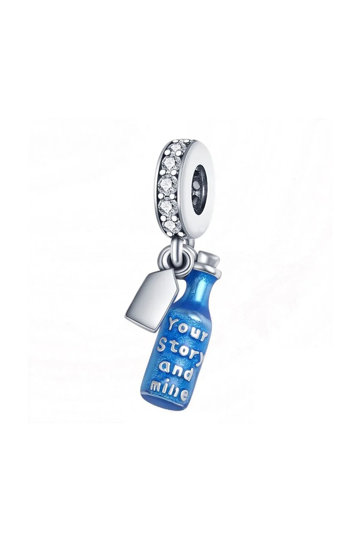 Mavi Hatıralar Şisesi Sallantılı Charm ''Your Story and Mine' Senin ve Benim Hikayelerim Yazılı Sallantılı Mavi Şişe Charm